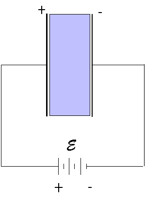 考慮一平行電容板,中間有介電物質。平行電容板的電位是E,所以在介電質中的電場E是: